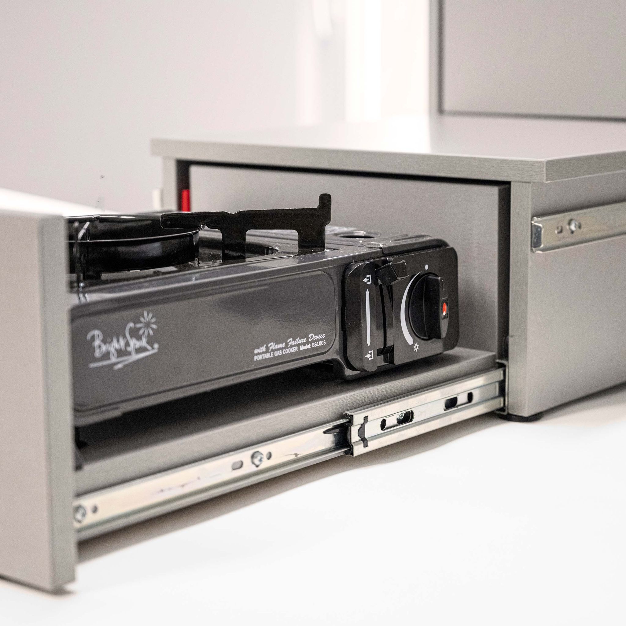 - Kocher auf vorgesetztem Einzug mit automatischer Brennunterbrechung beim Einschieben des vorderen Auszugs