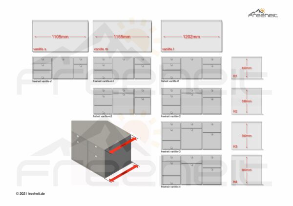 Die Vanlife Heckküchen von Freeheit sind in verschiedenen Breiten und Höhen erhältlich. Die Grundfunktionen sind bei allen Modellen identisch und die Möglichkeit des Einbaus einer modernen Kompressorkühlbox vom Typ Dometic CFF 35 ist unengeschränkt bei allen Modellen möglich. Ebenfalls verfügen alle Vanlife Heckküchen über den innovativen und praktischen Doppelauszug in dem der mit einer Zündsicherung ausgestatteten Gaskartuschenkocher seinen Platz findet. Darüber hinaus sind alle Vanlife Modelle mit Frischwassertank und fließendem Wasser ausgestattet. Durch die unterschiedlichen Breiten und Höhen sind die Vanlife Heckküchen mit über 50 Fahrzeugmodellen, ganz ohne Umbau kompatibel.