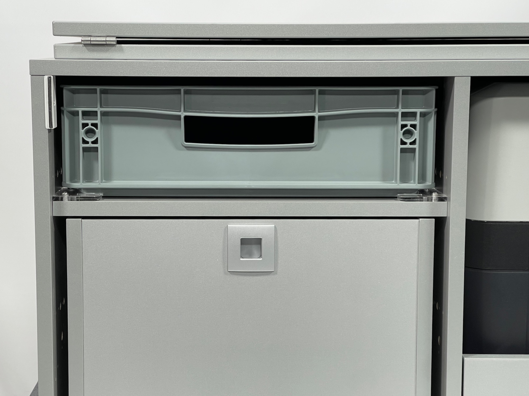- Edelstahlwanne auf Schwerlastauszügen zur Aufnahme der Kühlbox
