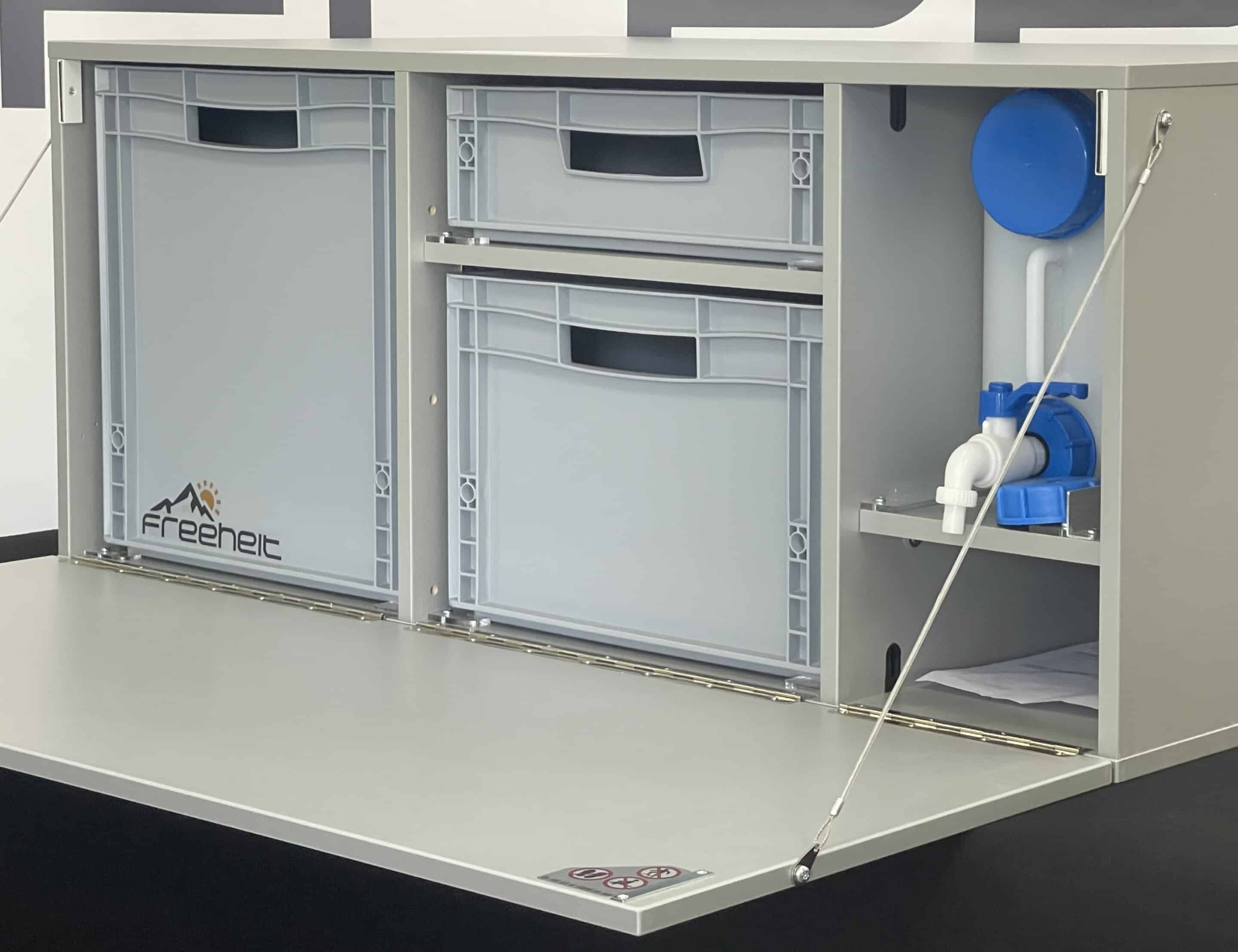 Egal ob mit Frontklappe oder Bettsystem, das Innenleben des Campingmoduls kannst Du ganz leicht online konfigurieren. Dies ermöglicht Dir einen günstigen Einstieg in die Welt der Campingabenteuer und Du kannst deine Campingbox später jederzeit Aus-, bzw umbauen. Und das Beste dabei ist, dass Du in den Fächern ohne Schubladen, handelsübliche Euroboxen verwenden kannst. Außerdem wird das Freeheit Flexicamp Campingmodul fix und fertig montiert zu Dir nach Hause geliefert. Das Flexicamp-System eignet sich prima wenn Dein Fahrzeug über einen durchgehenden Laderaumboden verfügt. Du kannst dann ganz ohne Aufwand, das Freeheit Bedrock Unterbausystem verwenden. Die Flexicamp Größen S,M und L unterscheiden sich lediglich in der Breite des rechten Fachs.
