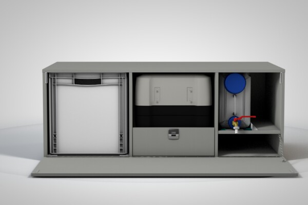 - Edelstahlwanne auf Schwerlastauszügen zur Aufnahme der Kühlbox