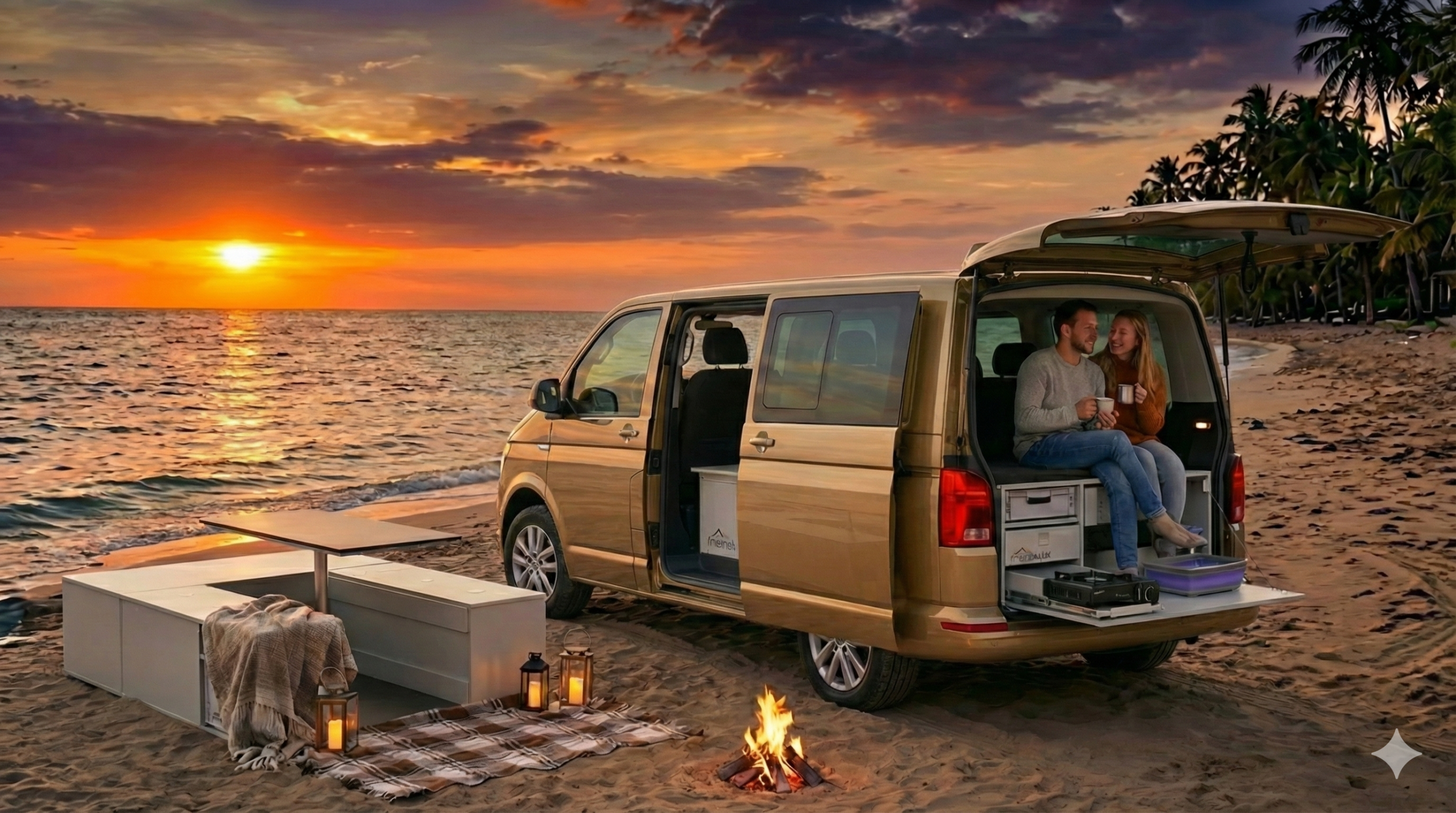 Mit der VW T6.1 Campingbox von freeheit wird Dein Bus in wenigen Minuten vom Alltagsfahrzeug zum vollwertigen Camper. Du entscheidest spontan, wann Du unterwegs bist – ohne Kompromisse, ohne Bohren. Das modulare Camper Modul System verbindet eine durchdachte Campingküche, Stauraum und maximale Flexibilität. Wenn Du alle Möglichkeiten entdecken willst, findest Du hier den passenden VW T6.1 Campingausbau für Dein Setup. Wenn Du Dein Fahrzeug flexibel nutzen möchtest, ist ein VW T6.1 Campingausbau ohne Bohren die ideale Lösung für Alltag und Reisen.